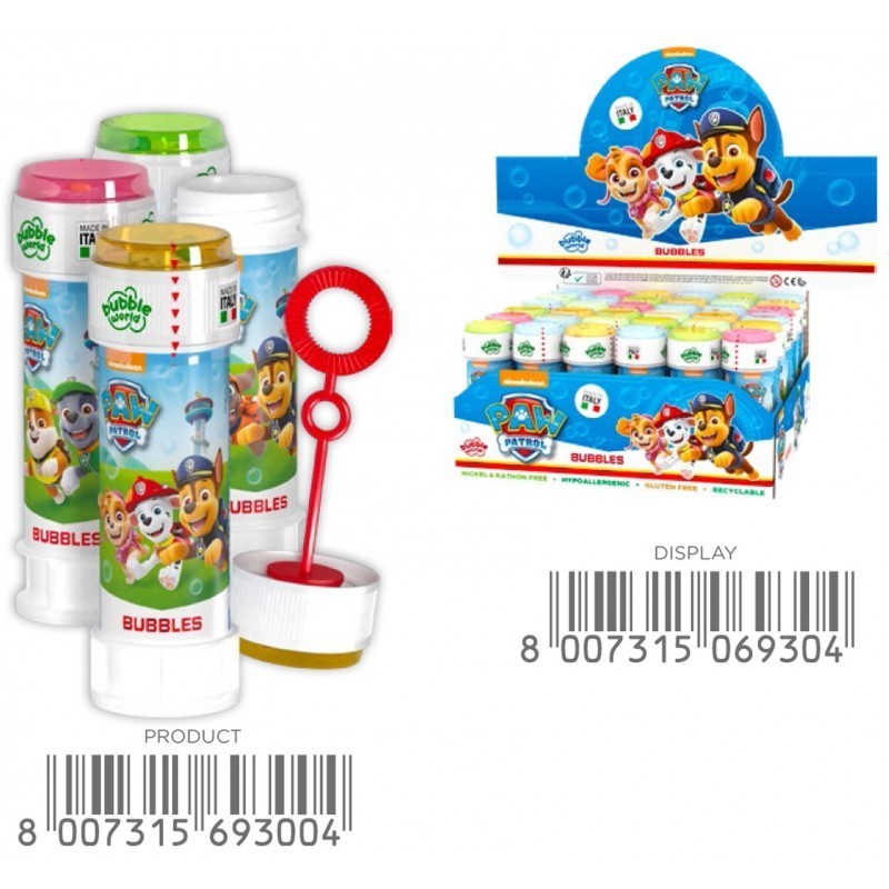 Art. No. 468 24 pieces premixed, 60ml Paw Patrol Bubbles are a fun activity for all ages. Bottle with Pustring and patience game in the lid.