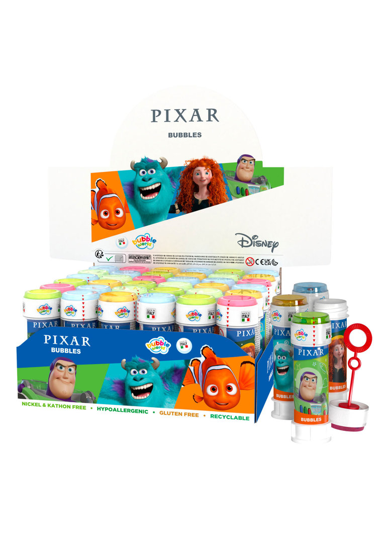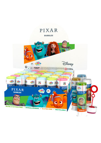 Art. No. 828 24 pieces premixed, 60ml Pixar Comics Bubbles are a fun activity for all ages. Bottle with Pustring and patience game in the lid.