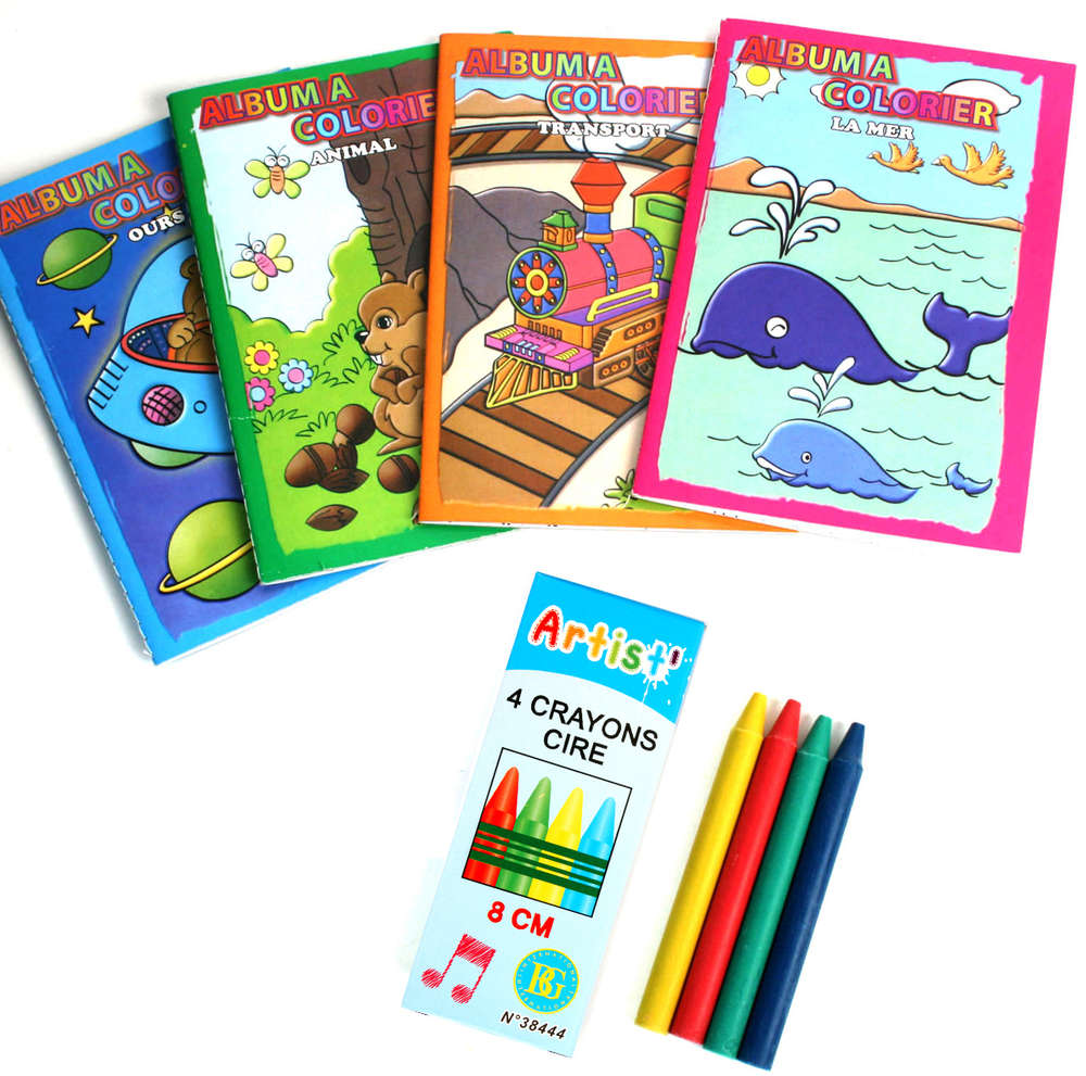 Art. No. 9016 24 sets of 4 mini-pencils and a mini-coloring book. A set of crayons consists of 4 mini crayons. Length of a colored pencil: 8.0 cm. Colors: red, yellow, green, blue. Four motifs of the coloring books: bear, vehicles, marine life and animals. Dimension of a booklet: approx. 13.0 x 9.0 cm, 8 pages.
