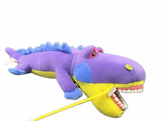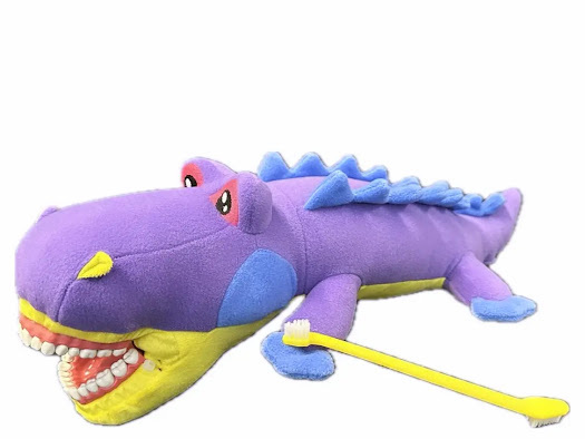 The purple demo puppet crocodile is approximately 35cm tall and was specially designed for dental practices. It comes with a toothbrush and is excellent for introducing patients to dental care in a playful way or reducing fears about treatments. This helps create a friendly and relaxed atmosphere in the practice.