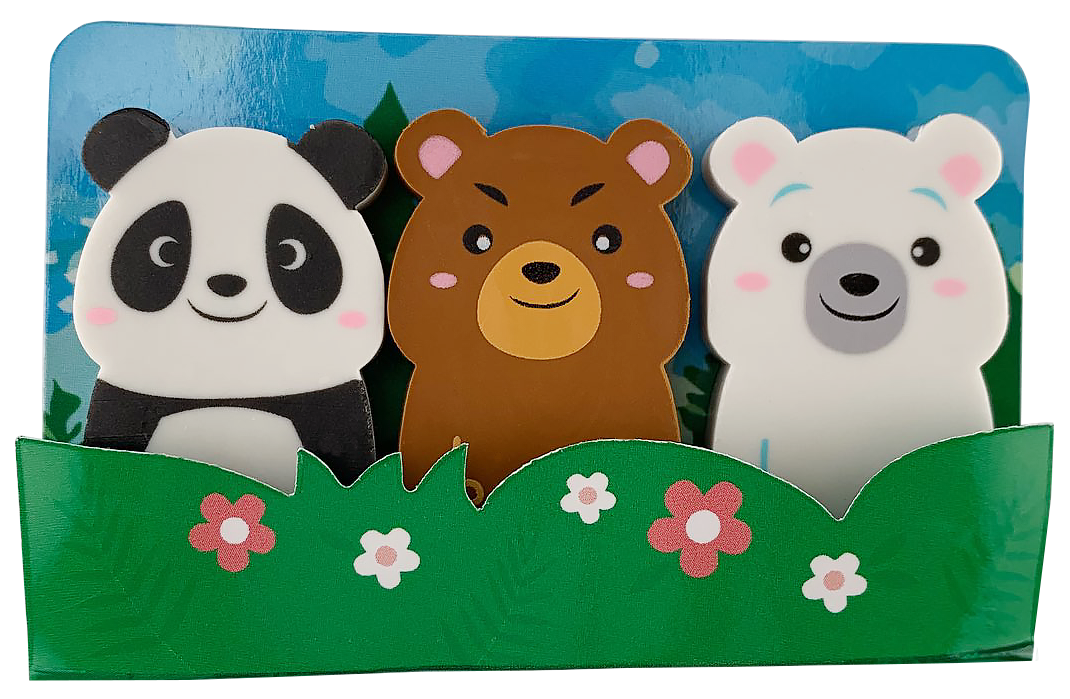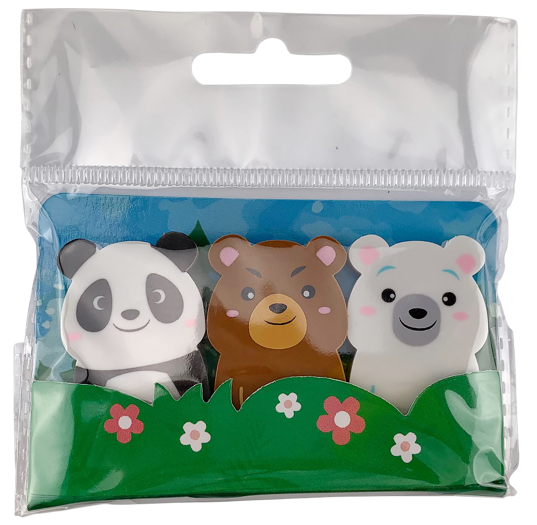 Art. No. 9073 72 pieces, different motifs and colors. Eraser bear in a set of 3 (24 packs of 3 erasers) Original size: 4.5 cm.