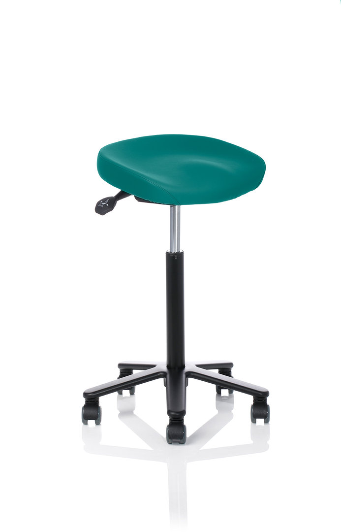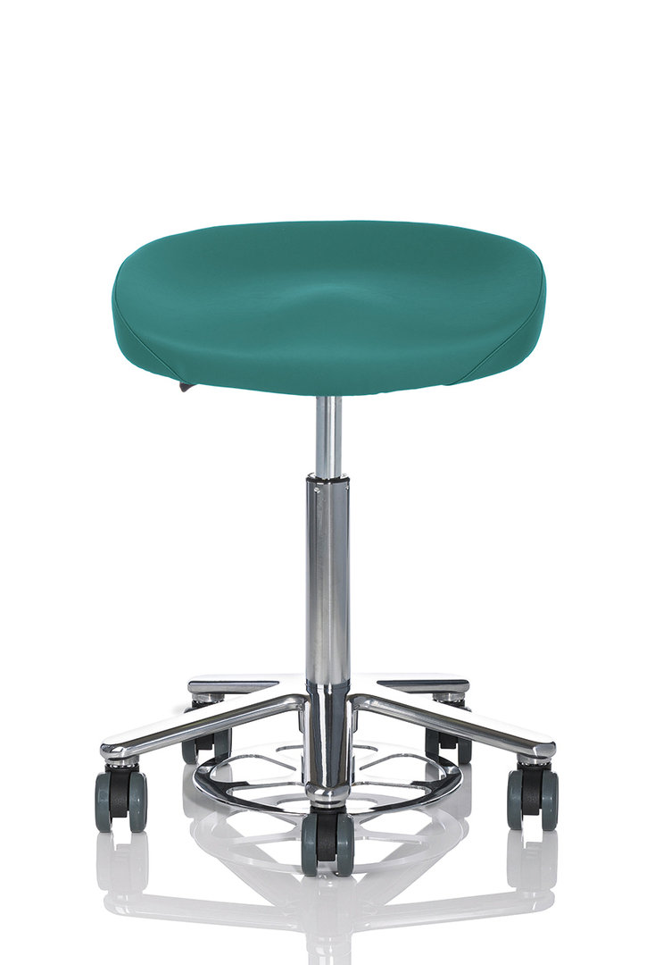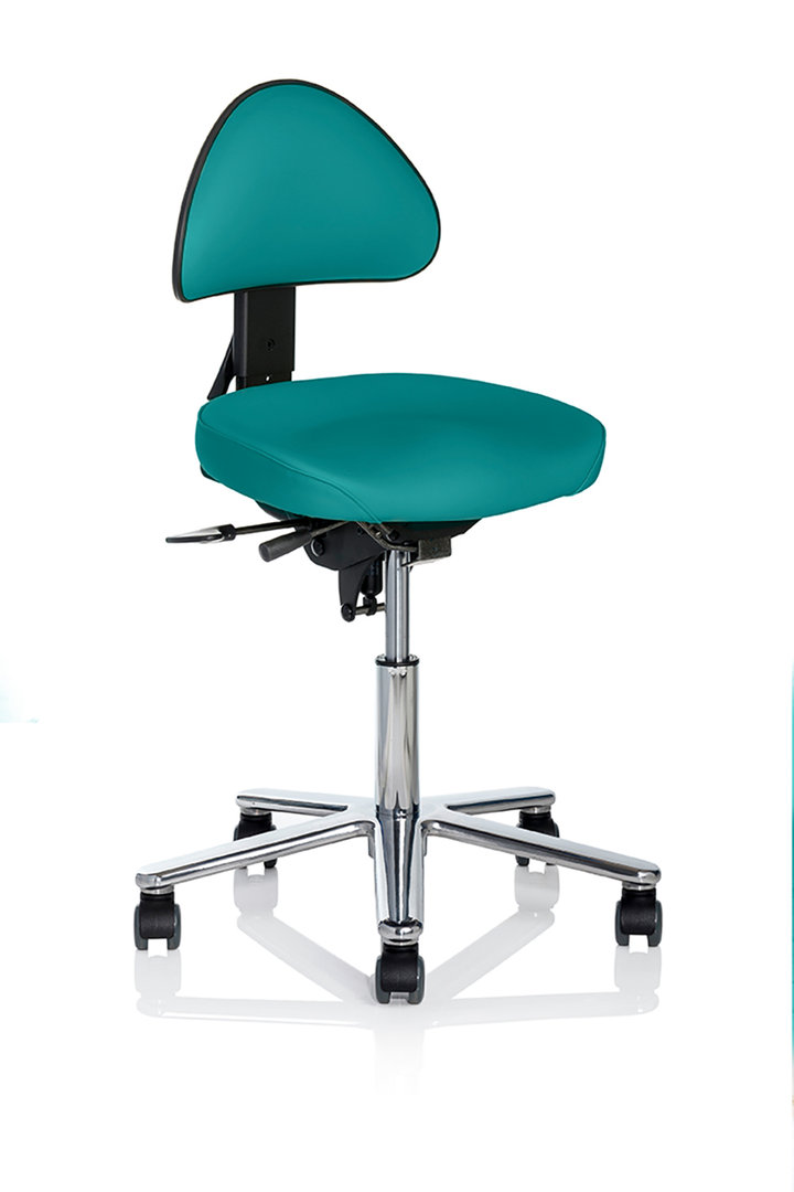 Verkürzte Sitzfläche für mehr Beinfreiheit. Preis ab 540 Euro (ohne Rückenlehne) und ab 790 Euro (mit Rückenlehne). Bilder von Behandlerstuhl Ergonova mit Zubehör.