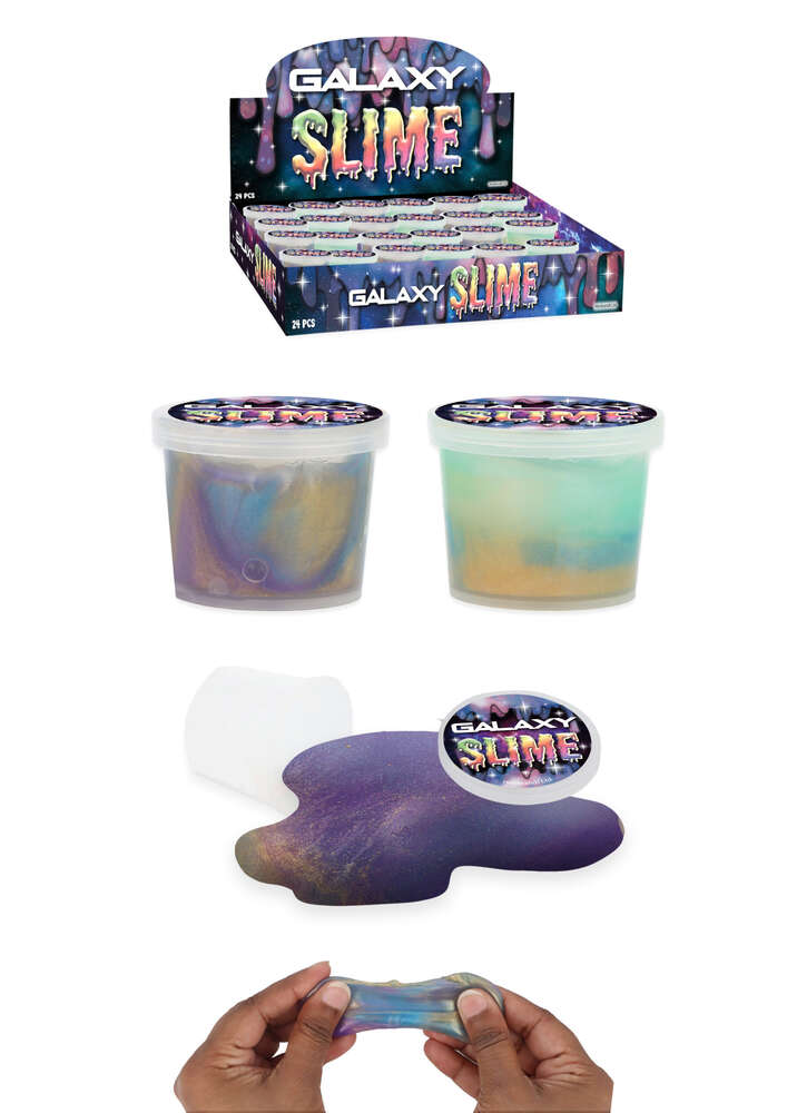 Art. No. 2071 24 pieces This shiny galaxy slime is ideal for party favours, lucky dip prizes and presents. Contains 20g