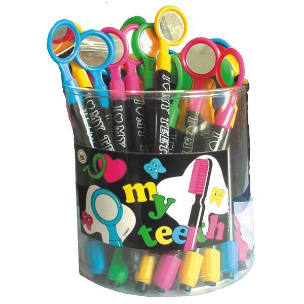 48 einzeln verpackte Zahnspiegel mit Radiergummi in schwarz mit farbigem (gelb, grün, blau und lila) Glasspiegel-Aufsatz. Aufschrift: I love my teeth. Ideal als Kinderzugabeartikel für Zahnarztpraxen.
