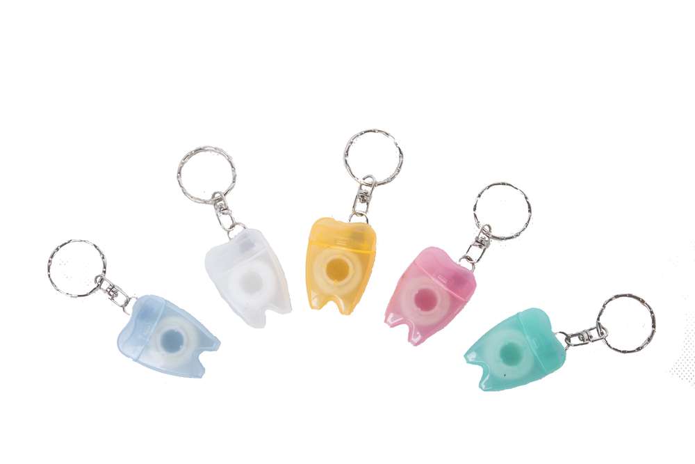 24 Zahn-Anhänger mit Zahnseide für den Schlüsselbund. Ein Mix aus verschiedenen Farben. Ein schönes kleines Geschenk für Kinder mit einem klaren Appell: Sorgt euch um eure Zähne!