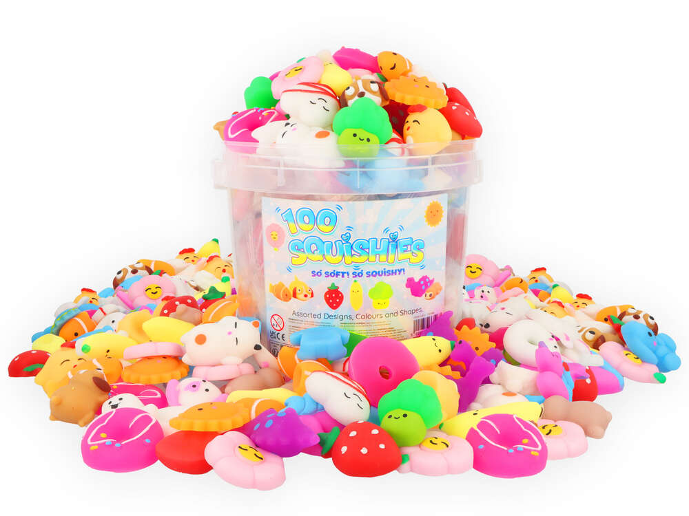 SQUISHIES 10G 100PC BUCKET 3-5CM ASSORTED COLOURS / DESIGNS