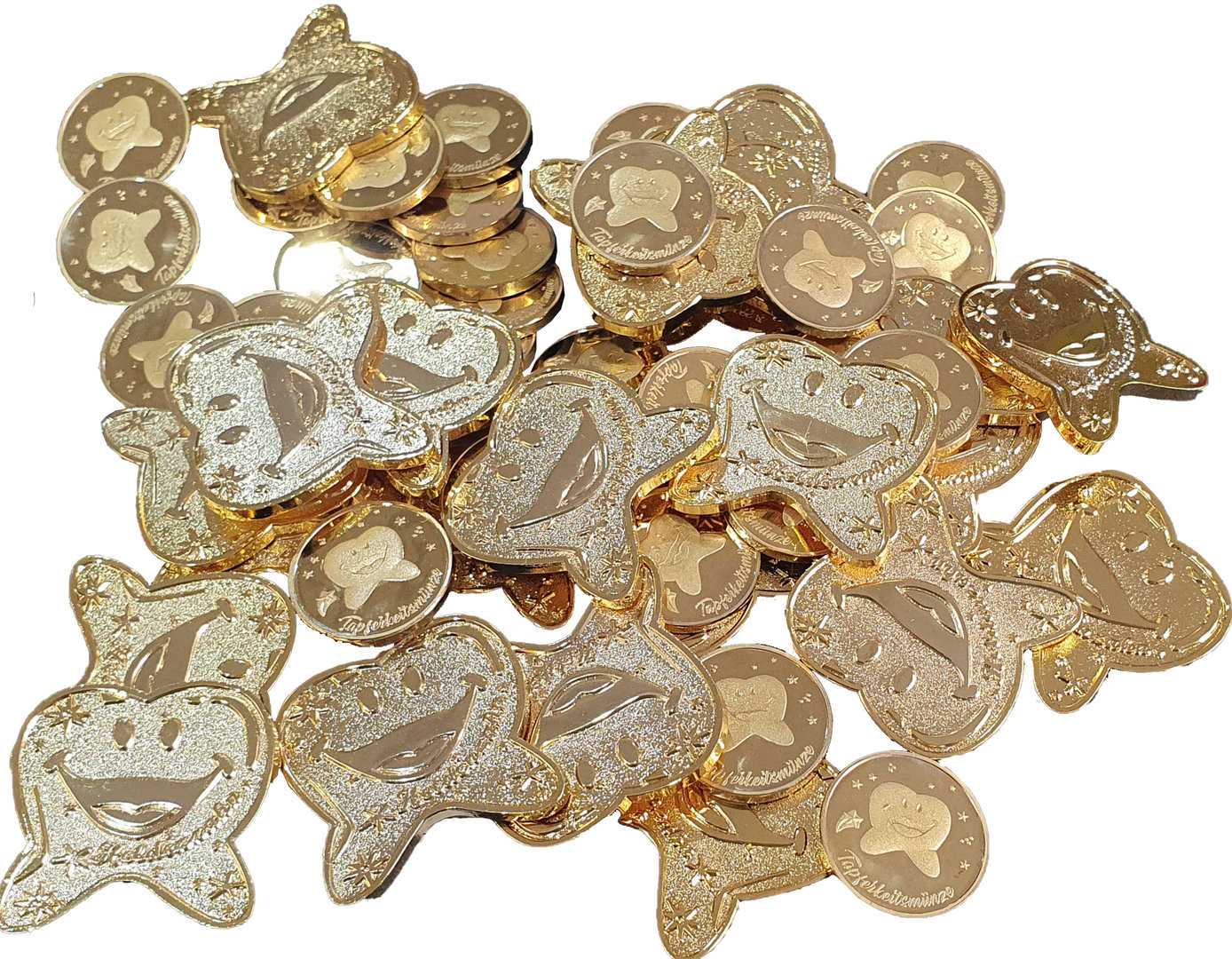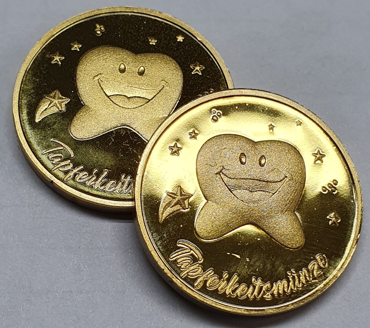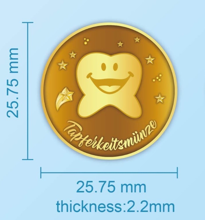 Für alle kleinen Heldinnen und Helden, die beim Zahnarzt ganz mutig waren: Hier kommt eine besondere Belohnung – die strahlende Tapferkeitsmünze aus hochwertigem Metall in edler Goldfarbe! Mit einem fröhlich lachenden Zahnaufdruck ist dieser Zahnfee-Goldtaler ein besonderes Erinnerungsstück für einen tapferen Einsatz. Die Münze hat einen Durchmesser von 2,6 cm und liegt wertig und glänzend in der Hand. Inhalt: 30 Stück