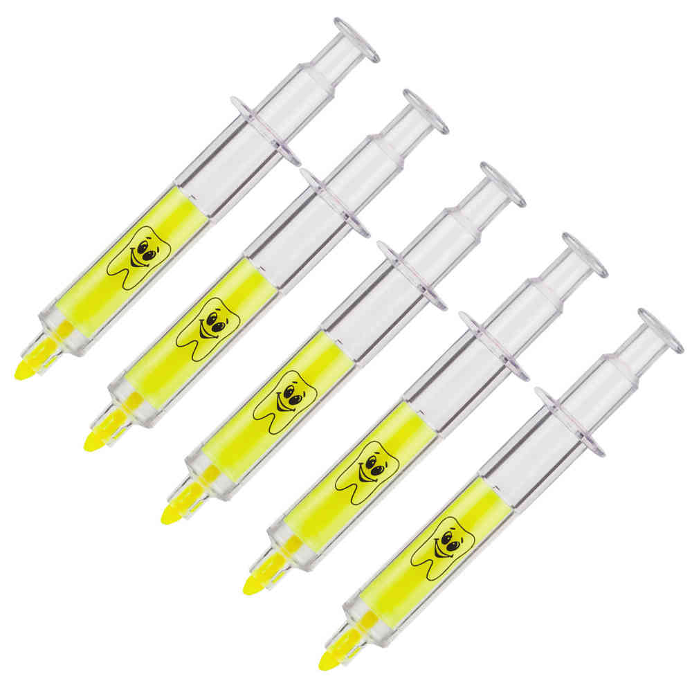 Die 24 Textmarker in Spritzenform mit freundlichem Zahnaufdruck machen Lernen & Markieren zum Erlebnis. Sie bringen Farbe auf jedes Blatt und eignen sich somit perfekt für Schule und Hausaufgaben. Die perfekte Motivationshilfe für kleine Heldinnen und Helden nach dem Zahnarztbesuch